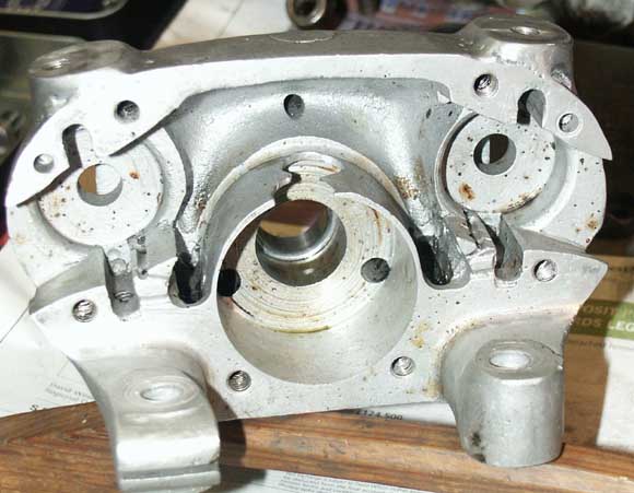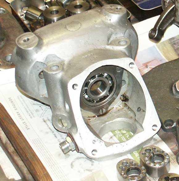 | The Cambox Castings The cambox that came with the engine was a standard alloy version (not the racing magnesium version), and overall it was in very good condition. As such, it was fitted with the road going side oil feed as used by non-racing International’s, of which more later. The main cambox casting particularly, did not show the normal horrors that can befall this component. It is not uncommon to find that the rear feet of the cambox have been broken off and re-welded. Even more common is to find that the aluminium ring that surrounds the cams (and is designed to capture oil being span out from the camshaft), has been broken away. Although this second fault is not too difficult to rectify (normally by machining a new ring and securing it in), it is still not a task to be taken lightly, so I was pleased it was not required. The rear cambox casting was also in good condition and as bought, the engine came with a new rear camshaft roller bearing for this backplate, which only required fitting. Interestingly, this bearing is actually bigger on the International than it is on the magnesium SOHC Manx version. Not quite sure why this is, but I do know that it is not cheap and becoming harder now to get hold off (postscript July 06 – I now stock these and other SOHC bearings if you require them, please go to my For Sale page to view my catalog). The castings had even been cleaned up ready for assembly making my life even easier. So, other than ensuring the threads were ok and that the mating faces were made true (easy on the front face as this can be emery’ed on a surface plate, but more difficult on the rear face, as the rear legs get in the way), the only real job to do was to provide the means for a central oil feed. | ||||||||||||||||||||||||||||||||||||||