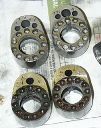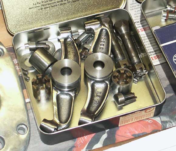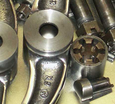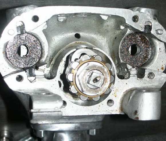 | The side thrust of the bearing rollers is taken by hardened steel shim washers that press into the rockers from each side once the cage and rollers are fitted. Finally, over these on either side fits unhardened lipped washers, that as supplied with my engine looked to be brand new. Once the bearings are oiled and assembled these lipped washers are placed over each side of the rocker before assembling in the cambox. The final component, which I assume is another aide to keeping the oil in, is the fitting of circular cork washers on either side of the lipped washers. These are fitted directly into each cambox casting and in my case were retained there by a light application of sealer. | ||||||||||||||||||||||||||||||||||||||