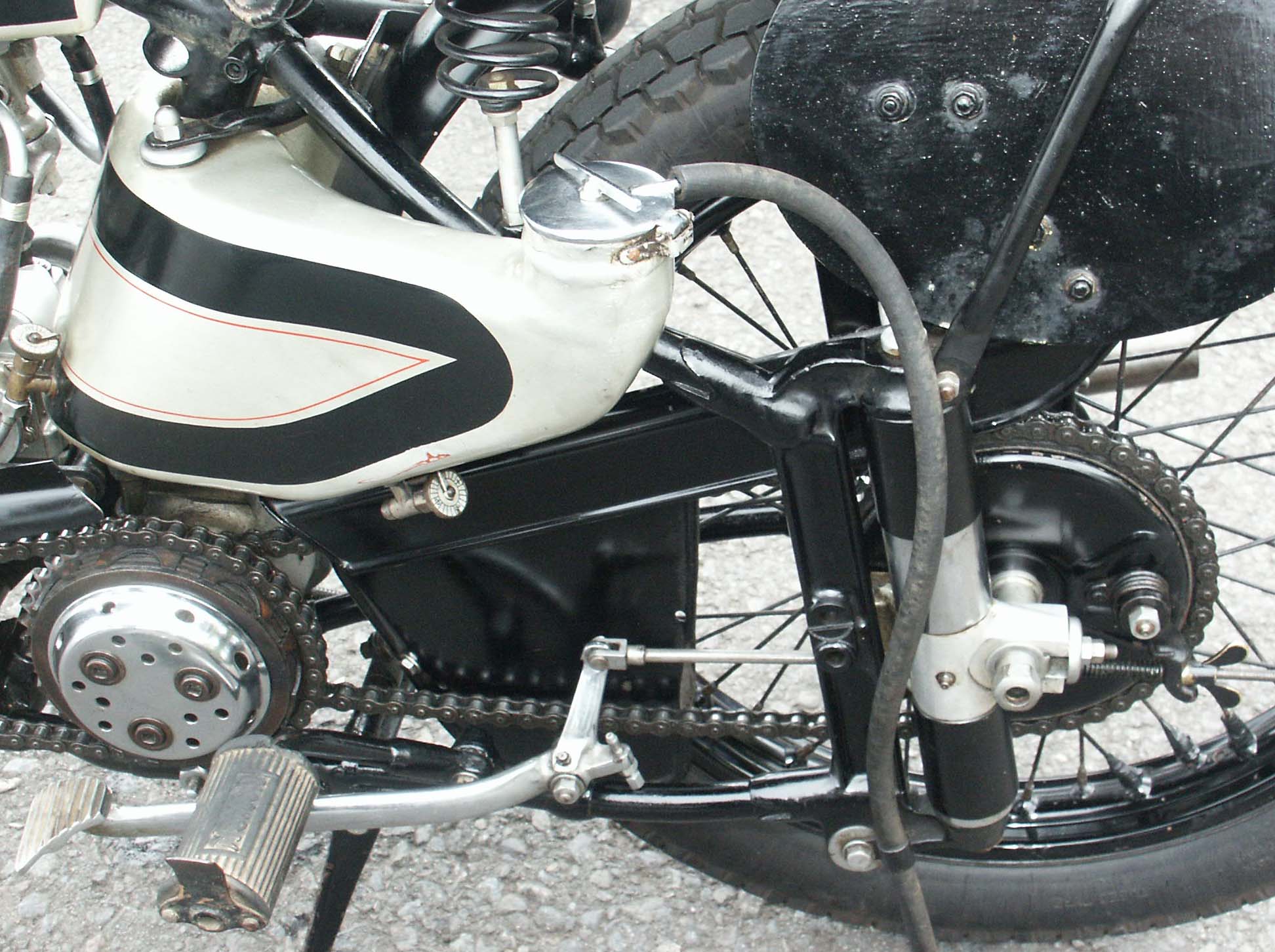 Note the tubular plunger frame - only used on this model of Works bike - and the unusual and easily noticeable large filter canister (at least - I think it is an oil filter!!)