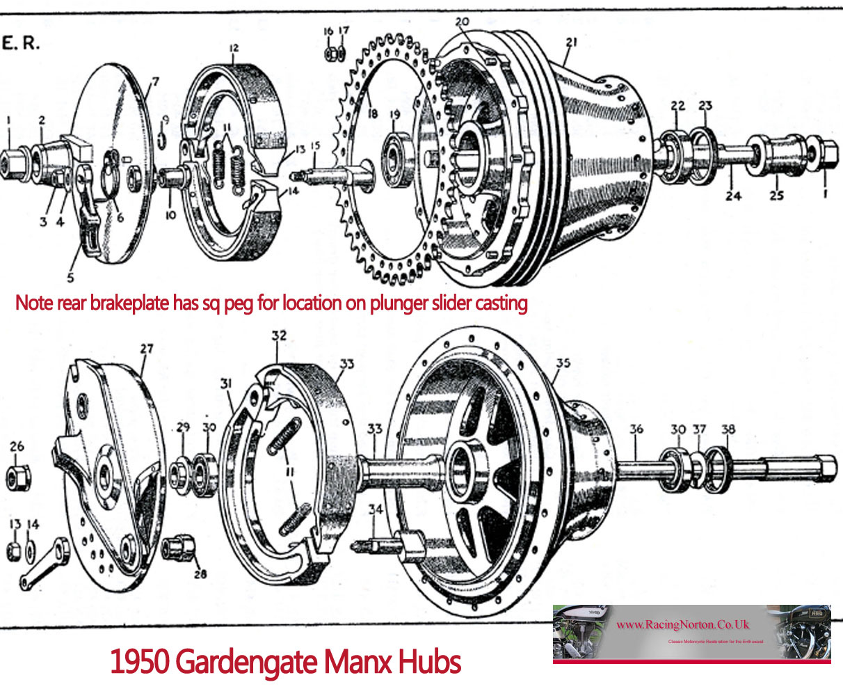 And below is the first Norton publication of the magnesium alloy hubs - this taken from the 1950 Spare Parts List. Note the rear brake plate which was a 'one year only' version - with square peg to fit into the Gardengate plunger slide castng - luckily I have the correct brakeplate for this project