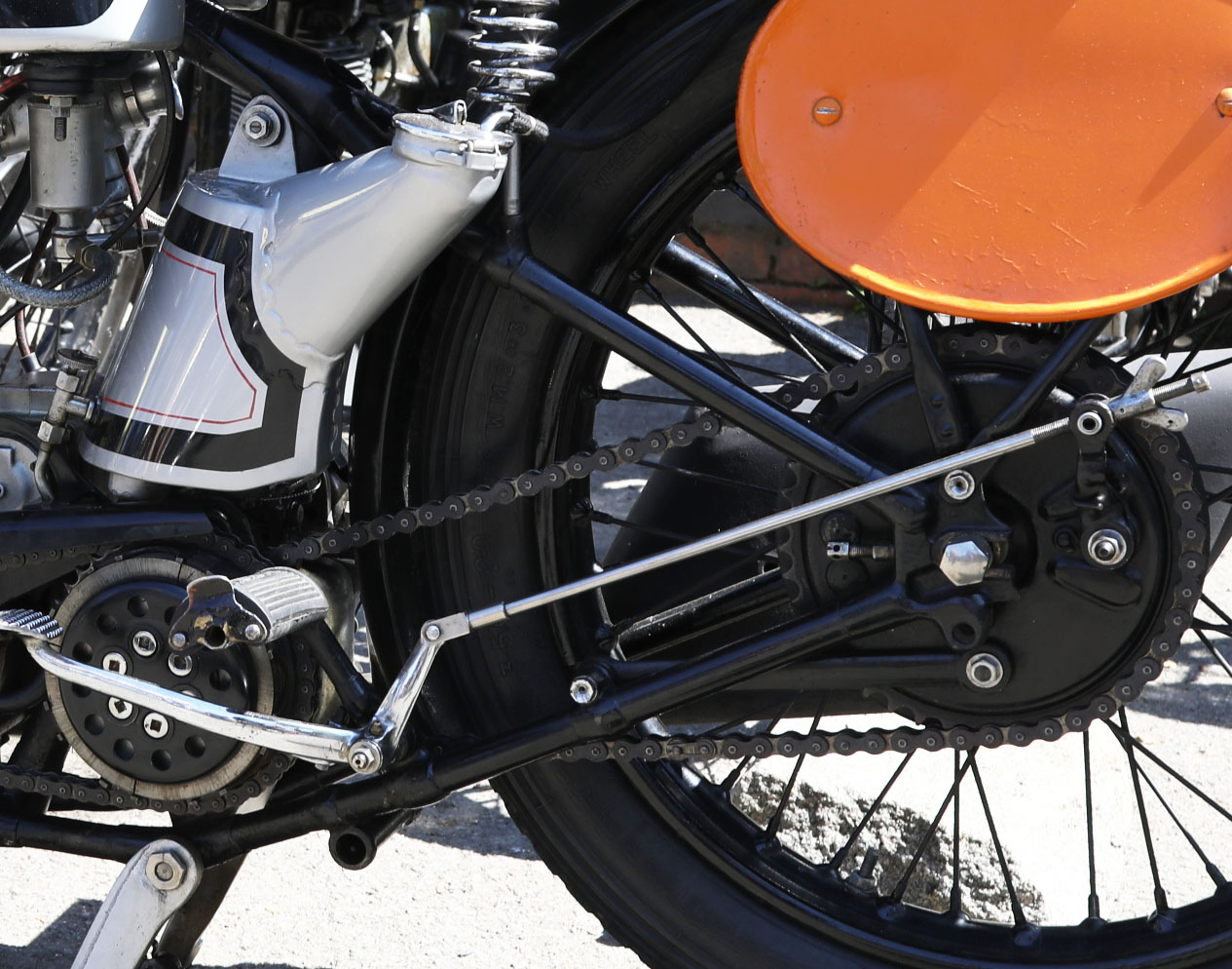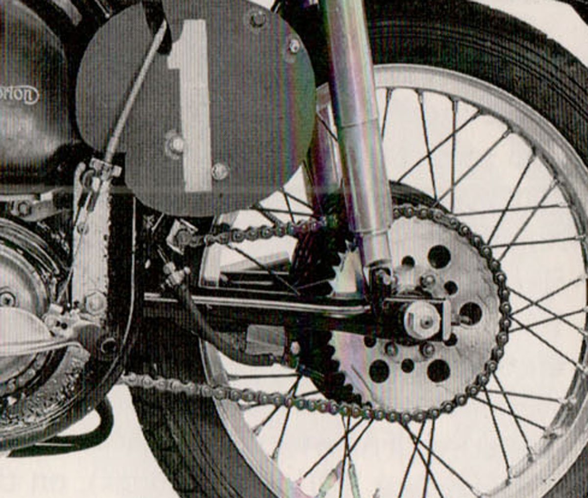 As far as that early rear ‘conical’ brake drum was concerned – they were never offered to the public in that form, only being employed on the 38-39 Works bikes pre-war. After hostilities ended and top level competition resumed in 1947, the same bikes were picked up again by the Works team, and used with only minor modification until the introduction of the first Featherbed Works bikes in 1950.