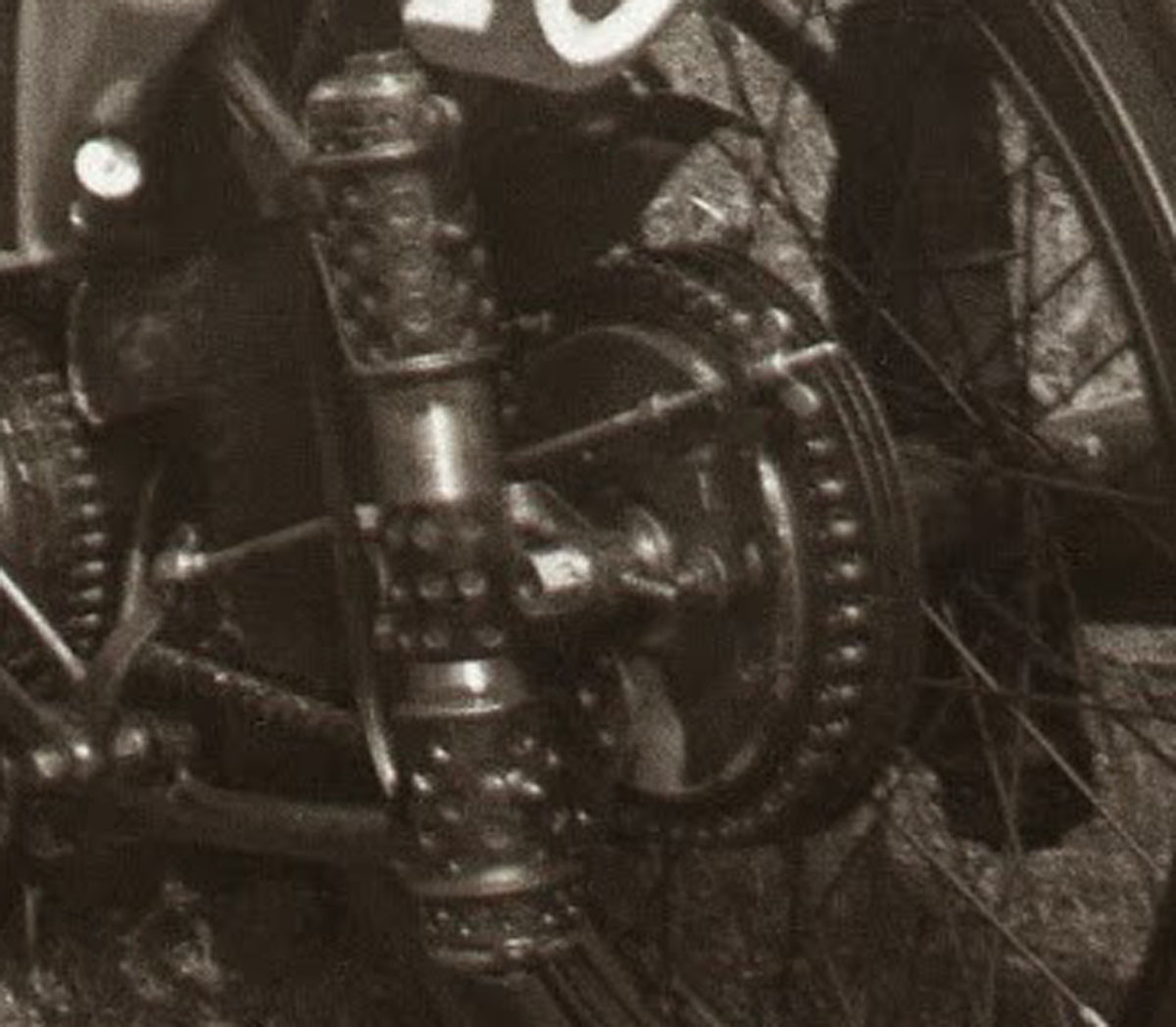 It it difficult to make out to much detail of the brake - but you can just make out some heavy finning of the brake drum and what is very probably an alloy/magnesium brake plate - although I cannot be sure. To my knowledge the few similar framed producton Manx spec bikes used the normal pressed steel brake plate