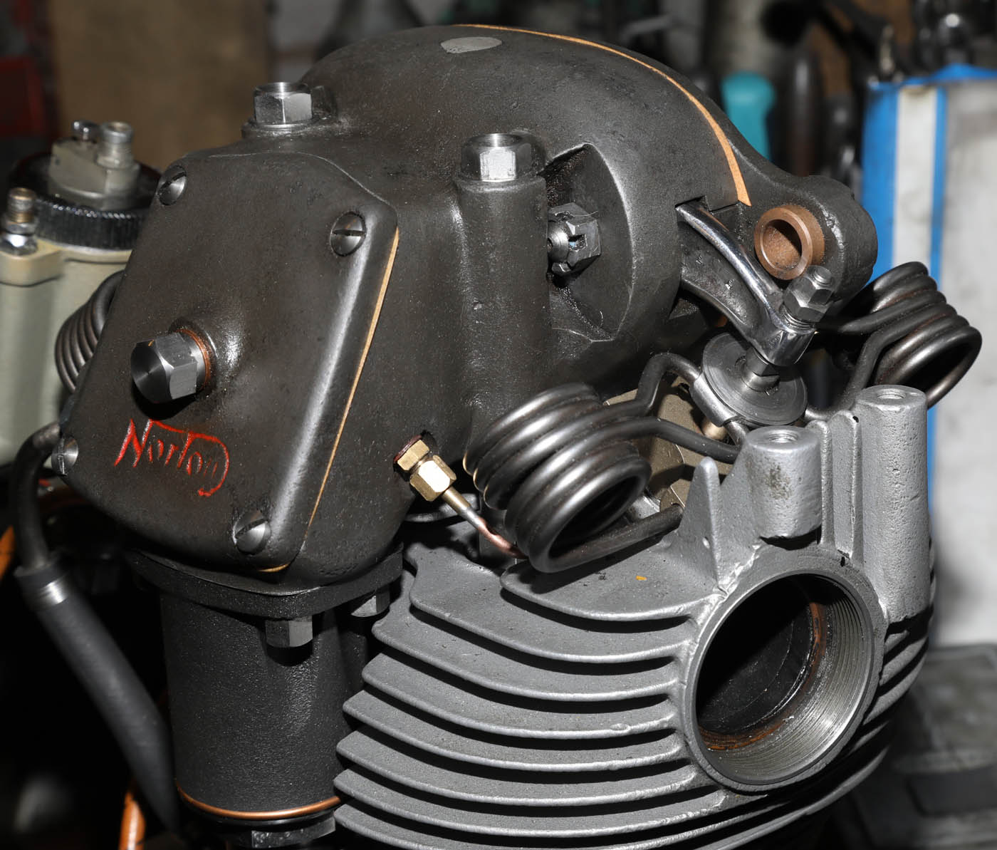The DOHC cambox was supposedly developed in this year as well - but was felt did not have enough development and was only used in practiice. The race bike instead being SOHC - but with enclosed rockers - of which two designs were developed. Click on photo to see larger version - notice it is fitted with twin spark BTH, tiried in 35-36 - I have one on my 39 Manx build