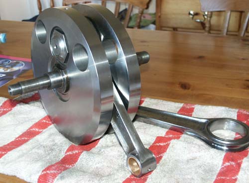 | Crankshaft and Crankcases: When I purchased the engine I had been told the crankshaft had been professionally rebuilt with a new Big End etc etc and was ready to use. I have to say, I am always very sceptical about taking this on trust with crankshafts, particularly when the results of a bad build can be so (shall we say) dramatic! Close inspection of the crankshaft did nothing to change this view so I decided to bite the bullet and send the crankshaft assembly away to Max Nightingale at Alpha Bearings, to have a ganders and (unless it really wasent necessary) fit a new racing big end. This turned out to be a very wise move, as a week later I received a call from Max to relay the bad news that the flywheel’s Big End journals were badly worn and would require some serious remedial work. This was followed up a half hour later to rescind the first status and replace it with the news that the whole crankshaft was scrap! It turned out that the timing flywheel had a hairline crack and it really wasent economical to go any further. Although this might sound like the sort of news every restorer dreads, it actually made life very easy, I now had no choice but to commission a completely new crankshaft from Alpha’s as well as the Big End they were already going to fit. Admittedly, I was not a happy man at the time (understatement used here. . . ), but the seller turned out to be a gentleman, and after some discussion offered some rebate from the original sale price (he had had the crankshaft 'professionally' rebuilt, so understandably was not happy himself, having not only paid good money, but also having sold it on described as thus). |