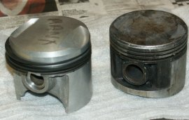 | Wobbling Pistons Eventually I was able to get an 80mm piston from Ken McIntosh in New Zealand, which again is a beautiful forged creation, this time made by Arias in America. Unfortunately, although a gorgeous piston, the one sent to me turned out to have a couple of thou clearance more than it should have for 80mm. As Ken always bores his barrels to match the piston, this had not been a problem for him, however after careful consideration, we both felt the clearance was slightly excessive, even by my standards (I would much rather have a bit of excess piston noise when cold, than a seize when warm). Ken was happy to take the piston back, and it was then a case of waiting for Arias to send another batch to Ken, with reduced clearance. In the interim I did look at Stu’s Omega pistons, but unfortunately these were not available in the required oversize. If you look at the accompanying photograph, you will see an interesting comparison between both piston types, both in my opinion both lovely in their own right. The Omega piston on the left is of the latest variety, with Teflon coated sidewall, the Arias piston on the right identifiable by its very high quality of final machining. In truth, both pistons look to be of a far higher quality than any I have used in the past, just a shame to use them really! Eventually the new Arias piston arrived, and this is the one I have now used for the final build. |