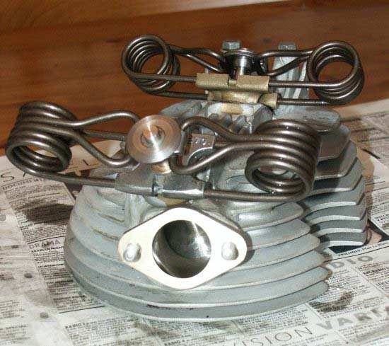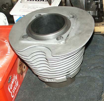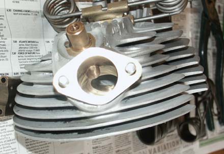 | Head and Barrel As I mentioned earlier, one of the most attractive features of the engine when first offered, was that it had a very desirable bronze skulled alloy head and alloy barrel. On close inspection the head looked very nice, with very little noticeably amiss. Unfortunately, both valve seats looked slightly pocketed, which is not uncommon with these bronze heads (seats are not very hard), but other than that, pretty good. At some time in its past the exhaust port thread had obviously been damaged, as this had had a steel insert put in, but whoever did it had made a very professional job of it as it looked very neat. Actually, when looking at the head closely with Stu Rogers, a couple of months later, we noticed that a very small locating screw had been used to hold the threaded ring in place, this being very subtlety added from above, between cooling fins. We will see how this works in practice – hopefully it wont come loose under working conditions. |
