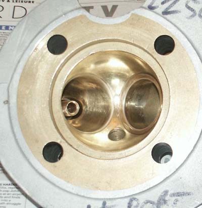 | Valves I talked to Stu Rogers about the pocketed valves, and also about the specification of head he uses on his own (very fast!) racing engines. He told me that his heads use a larger inlet valve than standard, with a inlet tract bored to suit. He also suggested this works best with a smaller exhaust valve (which I assume, is useful in that it means less chance of valves clashing with the larger inlet valve. I decided that as I was going to have to have the seats looked at anyway, I would entrust the work to Stu, and have the mods he suggested done as well. What I liked about the idea of the bigger inlet valve, was that it meant I might get away with not needing a new valve seat, as the seat was going to be opened up anyway. Anyway, a few weeks later I went up to Stu’s (sideways actually, Stu is near Wisbech and I am close to Leicester, and picked the finished job up. As well as fitting a larger inlet valve and a new exhaust valve seat, he had also opened up the inlet tract to a whopping 1.250". In the meantime, I had managed to get hold of an alloy 10TT carburettor and had machined it out to the same (very large) bore. It will be interesting to see how well this works, but I am assured by Stu that a similar arrangement in his own engines gives very satisfactory results. Final job on this was for me to reduce and shape the inlet guide (I cant help myself, I always do this) and at the same time take the opportunity to do some extra detail work on flowing the inlet port and final polishing. I think you will agree from the photographs, that if nothing else, the finished job in bronze certainly looks luvvly! |