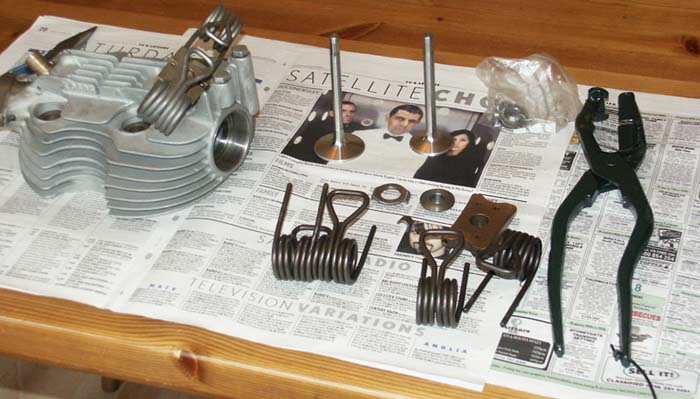 and How to Compress Them The Hairpin valve springs used on cammy Nortons are one of the most distinctive parts of the engine and are synonymous to me of exotic 1930's engines. The only problem with using them (apart from the fact that they are exposed and allow Castrol R to be flung out all over the rest of the bike!) is that you cannot fit them using a standard valve spring compression tool. This provided an interesting diversion from assembling the engine, as I decided what to do about a special tool for the job. Obviously, hairpin valve spring compressor's are not the sort of tool you can buy from Machine Mart, so the first thing to do was to try and dig out all those old line drawings seen in 1930's instruction manuals, that would at least give me a reminder what they look like. Looking at a pair made by Stu Rogers when I was in his workshop a few days later, was also very useful to give me a good idea how they should be made. What I really needed as a starting point was an old pair of some sort of blacksmiths tongues, that I could then convert. Having hunted my own garage to no avail, help came in the form of a pair of old tin snips in Titch's workshop which he remembered as 'never being any good . . .' (to be fair, as Titch is in his late '80's he doesn't even use his better tools quite as much these days!). Once I had the tin snips home I set to with them, first heating one of the cutting blades with an oxy-acetylene torch, so I could bend it through 90 degrees, where it could form a platform for a fabricated lip that would seat around the base of the hairpin spring. The other blade was then ground down for much of its length and I brazed to this a specially shaped tool that would press down on the top tongue of the spring. Finally, I then heated and re-formed the handle positions, so that the two handles could be easily held with one hand, once the spring was compressed. I made a little steel ring, attached by a cord, that could be placed over the handle so it could hold be left compressed, freeing both hands. Finally, having cleaned them up, I painted them a very pleasant shade of British Racing Green, just to add a bit of BS! The finished result was surprisingly pleasing to the eye and has made fitting the springs quite a pleasure, particularly knowing they have been made specially for the job. |
